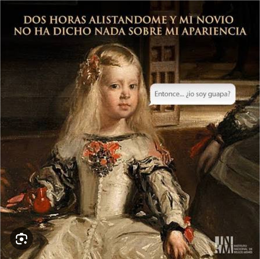 "Las Meninas": Esta es la obra más recurrente para memes. Se utiliza para crear situaciones cómicas sobre la complejidad de las relaciones familiares o sociales, a menudo con leyendas que juegan con las miradas o las posturas de los personajes.