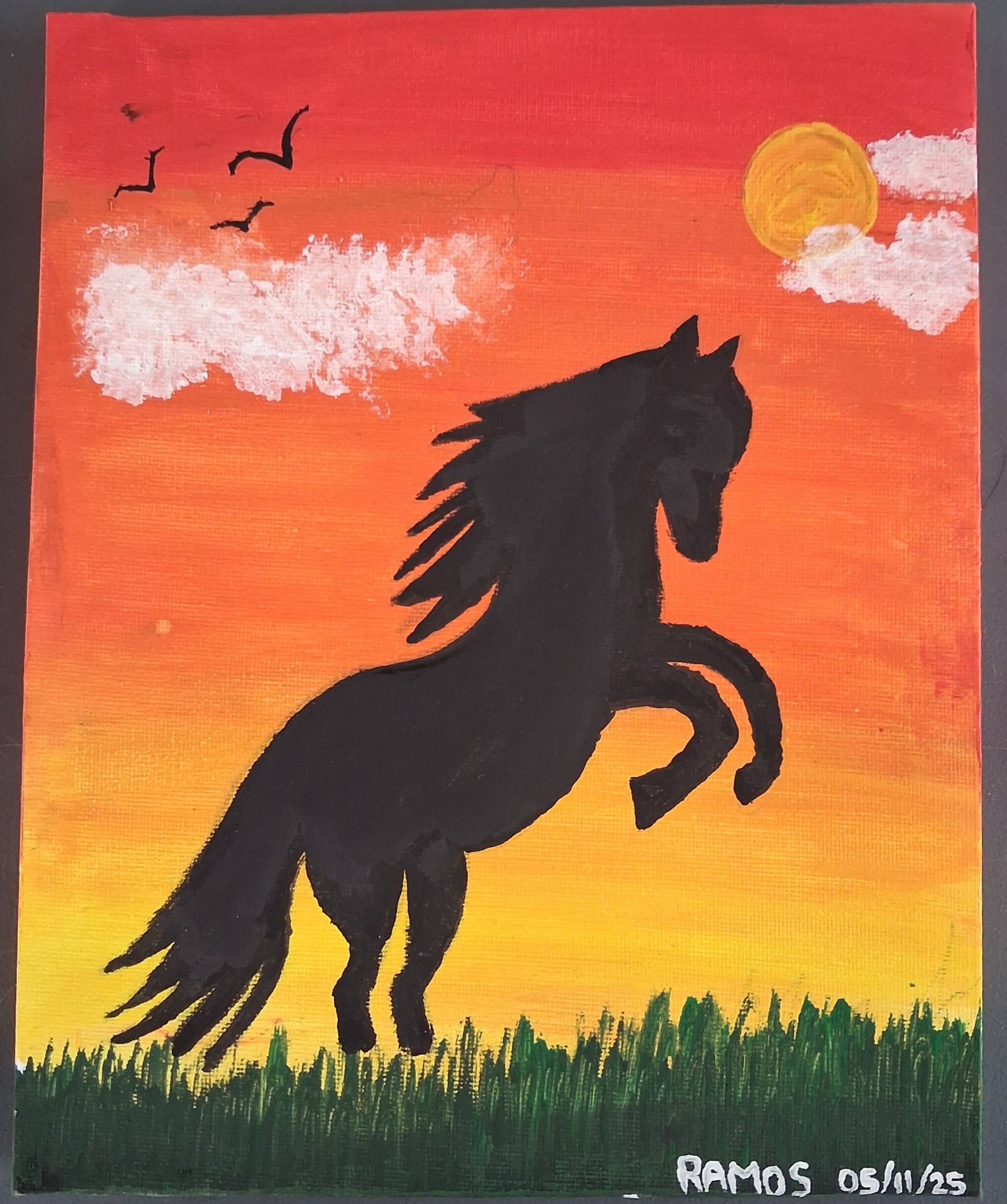 Simbolismo: Esta imagen representa la fuerza interior, la libertad y el poder personal. El caballo negro levantado simboliza energía que no se deja controlar, carácter firme y espíritu libre. El fondo en tonos naranja y rojo del atardecer refleja pasión, impulso, fuego interno y comienzo de nuevos ciclos. El sol marca luz, guía y continuidad, mientras el pasto verde conecta con la tierra y la vida.
